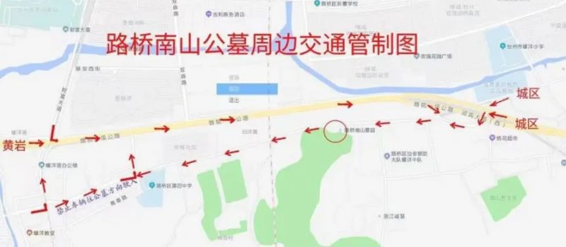 螺洋街道南山公墓:4月4日至4月6日每日7时至16时,院路一级公路与十路线交叉路口(南山红绿灯)至十路线路桥四中(螺洋中学)路段东往西单向通行;十路线路桥四中(螺洋中学)路口往东禁止车辆行驶;十路线(院路一级公路路口至G104国道路口)大货车全天24小时禁行。