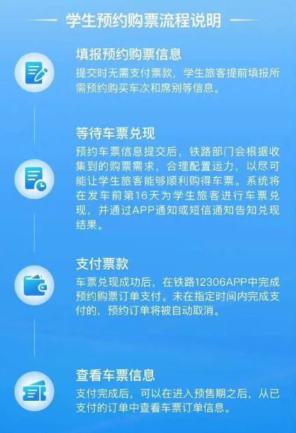 预约车票信息提交后,铁路部门会根据收集到的购票需求,合理配置运力,以尽可能让学生旅客能够顺利购得车票。系统将在发车前第16天为学生旅客进行车票兑现,并通过APP通知或短信通知告知兑现结果。