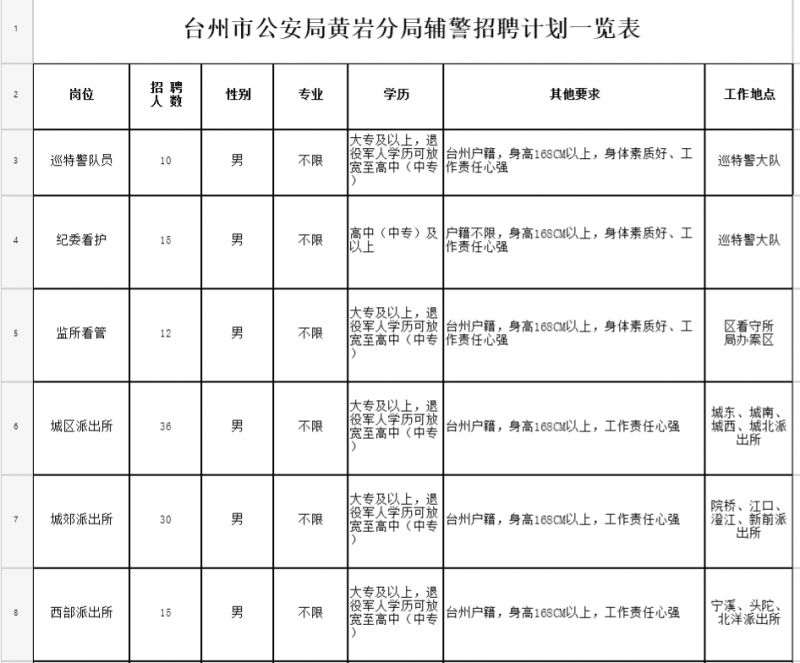 由于我无法实时获取最新的招聘信息,以下是一个假设性的岗位详情一览表,仅供您参考。具体招聘信息请以台州黄岩公安局官方发布的公告为准。