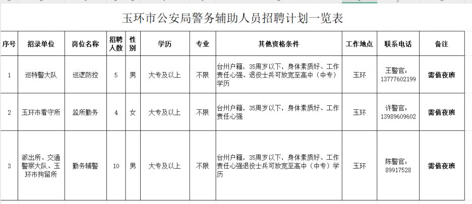 玉环市公安局警务辅助人员19名。具体岗位要求见《玉环市公安局警务辅助人员招聘岗位一览表》(附件1)。