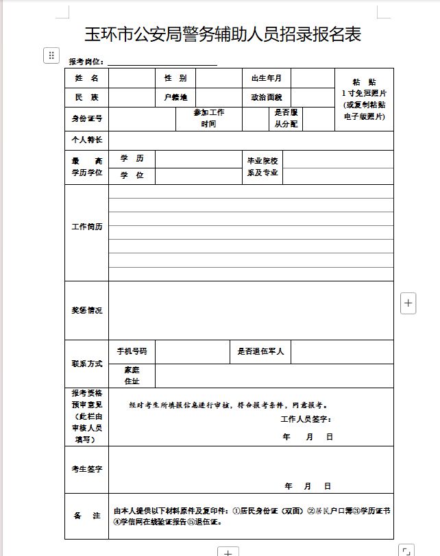 附件2:玉环市公安局警务辅助人员招录报名表.doc