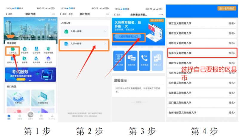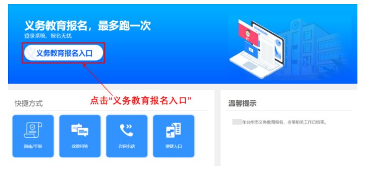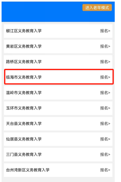 在台州市义务教育入学服务平台主界面中选择报名学校所在区域入口。