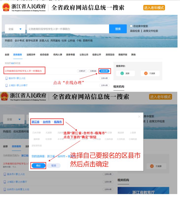 电脑搜索“浙江政务服务网”网址(https://www.zjzwfw.gov.cn)并登录系统账号,在“浙江政务服务网”的左上方搜索栏中,搜索“义务教育阶段学校学生入学一件事联办”;在找到的“义务教育阶段学校学生入学一件事联办”项目,点击该项目的“在线办理”并选择“浙江省-台州市-临海市(选择自己要报名的台州区县市)”点击下方“确定”进入入学服务平台首页。