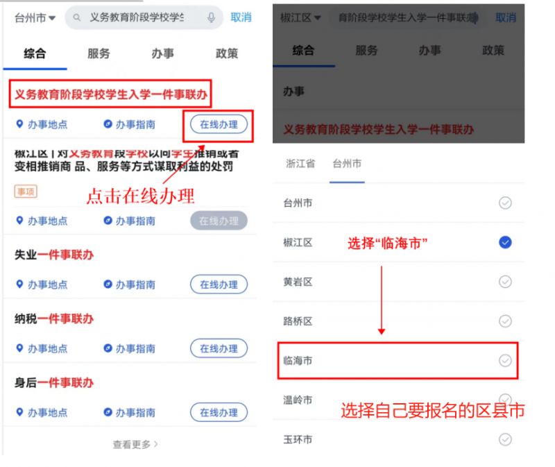 下载安装“浙里办”手机APP,并登录系统,在上方搜索栏中,搜索“义务教育阶段学校学生入学一件事联办”;在找到的“义务教育阶段学校学生入学一件事联办”项目,点击该项目的“在线办理”并选择“浙江省-台州市-临海市(选择自己需要的区县市)”,选择完毕后进入入学服务平台首页。