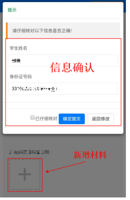 当所有信息修改完毕后,家长若需要补充报名批次类型所需要的佐证材料照片,点击加号即可上传对应的佐证材料照片,上传完毕后点击下方的“保存”按钮,平台需要家长再次核对学生的信息,确认无误后勾选“已仔细核对”并点击“确认提交”按钮。