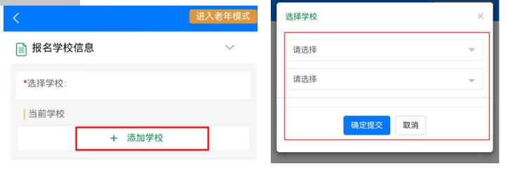 选择报名学校时,点击下方的“添加学校”按钮,选择所需填报的学校。