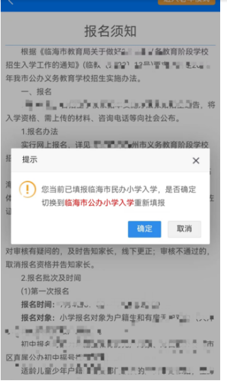 首先需要点击公办学校的入口进入“绑定子女信息”,点击子女信息进入公办学校表单,首先弹出提示“您当前已报名民办学校入学,是否确定重新填报其他学校”,点击“确认”,继续填写信息。