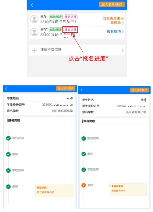 另外家长也可通过点击绑定子女信息页面中的“报名进度”进行查看学校详细的审核进度。若已被学校录取系统进度中所有流程都以绿色显示;若未被学校录取或被学校审核不通过,系统进度中的对应流程会以红色显示,并显示具体原因,供家长查看。