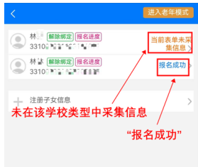 首先报名完毕之后,选择报名的学校类型入口进入“绑定子女信息”页面,子女报名成功后右侧则会显示绿色“报名成功”字样。未报名的新生及进入与报名成功时不一致的入口右侧则会显示红色“当前表单未采集信息”字样。